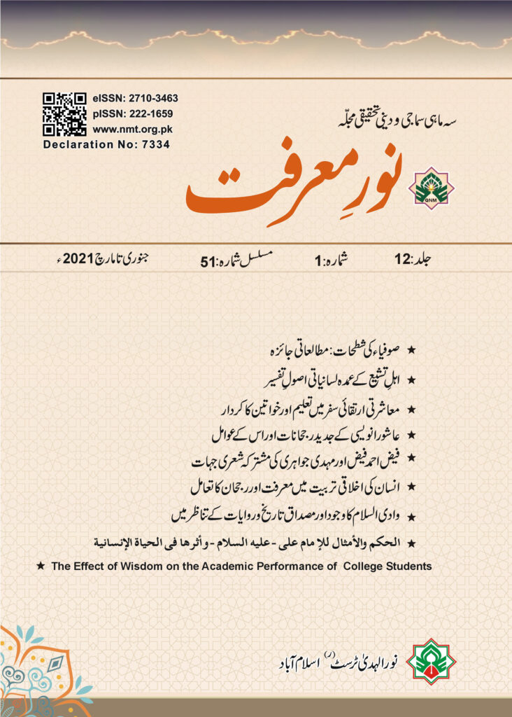 اسی طرح موجودہ شمارے کے چوتھے مقالے میں ” قرآنی مثالی معاشرے کے تحقق میں درپیش فکری و اعتقادی چیلنجز اور مشکلات کا تحقیقی جائزہ” پیش کیا گیا ہے۔ یہ مقالہ ہمیں اُن فکری، عقیدتی انحرافات سے روشناس کرواتا ہے جو ایک قرآنی مثالی معاشرے کے قیام کی راہ میں حائل ہیں۔ اس شمارے کے پانچویں اور چھٹے مقالوں میں ” برصغیر میں اسلام کے ابتدائی آثار” اور ” غزوۂ بنو قریظہ کا تاریخی وتحلیلی جائزہ” کے عنوانات کے تحت دراصل، اسلام کی روح پرور اور مسالمت آمیز تعلیمات کو اجاگر کرنے کے ساتھ ساتھ مستشرقین اور اسلام دشمنوں کی اِس الزام تراشی کا جواب دیا گیا ہےکہ اسلام خشونت پسندی، دہشت گردی اور تلوار کا دین ہے۔ ساتویں اور آٹھویں مقالات میں حالیؔ اور بابا بلھےؔ شاہ کے کلام کی روشنی میں سماجی اصلاح اور انسان سازی کے پہلو کو اجاگر کیا گیا ہے۔ اس شمارے کا نواں مقالہ “تحديات الدعوية فى زمن النبوة فى العهد المكي، صورها فى العصر الحاضر ومعالجتها فى ضوء المنهج النبوي” کے عنوان سے مزیّن ہے۔ یقینا یہ مقالہ اربابِ دعوت و ارشاد کے سامنے حضور اکرمﷺ کی سیرت و کردار سے ایسے نمونے پیش کرتا ہے جن کی پیروی میں وہ اہلِ دنیا تک اسلام کا پیغام حکیمانہ طریقے سے پہنچا سکتے ہیں۔اس شمارے کا دسواں مقالہ The Relationship of Social Behavior with Suicidal Ideation کے عنوان سے مزین ہے جس میں خود کشی اور خود کش حملات کے نفسیاتی اسباب تلاش کرنے کی کوشش کی گئی ہے۔ یقینا یہ مقالہ دہشت گردی کے سدّباب کی راہ میں پہلا قدم ہے اور اسلامی جمہوریہ پاکستان میں امن و امان قائم کرنے والے اداروں اور شخصیات کو کلیدی رہنمائی فراہم کرتا ہے۔ اسی طرح اِس ملک کے اقتصادی مسائل کے حل کے حوالے سے جو کہ بذات خود بے امنی اور دہشت گردی کا ایک عمدہ سبب ہیں، سہ ماہی نور معرفت کے موجودہ شمارے کا گیارہواں مقالہ Values and Well-being in Pakistanکے عنوان سے شامل اشاعت ہے۔ یہ مقالہ اسلامی جمہوریہ پاکستان کے عوام کی اقتصادی فلاح و بہبود میں الٰہی اقتصادیات کی تاثیر کے بارے میں بحث کرتا اور عوامی فلاح و بہبود کے الٰہی معیار متعارف کرواتا ہے۔ ہمیں امید ہے کہ علمی، تحقیقی سہ ماہی مجلہ نور معرفت کا یہ شمارے علمی حلقوں میں بہترین پذیرائی حاصل کرے گا اور ہماری دینی، سماجی مشکلات کے حلّ میں عملی اقدامات تجویز کرے گا۔ ان شاء اللہ!