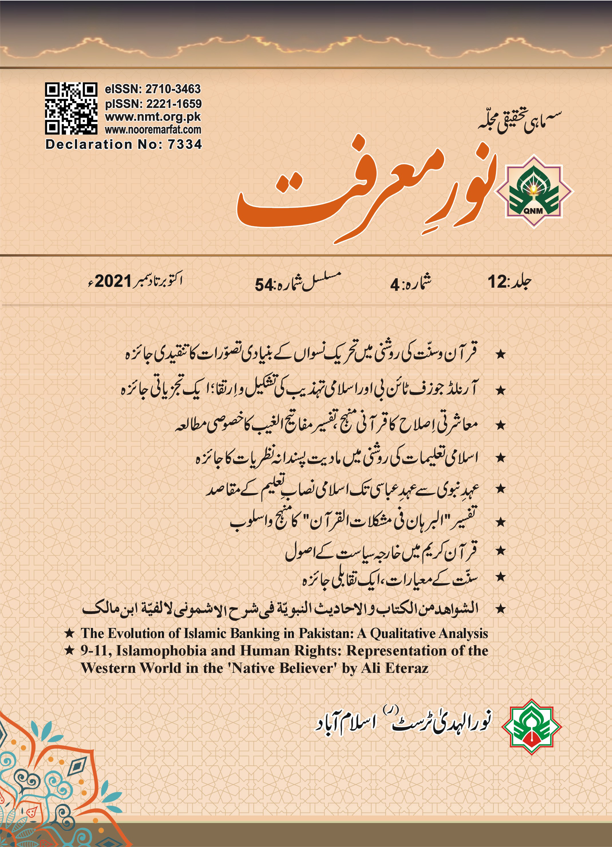 The 54th issue of the quarterly research journal Noor-e-Ma’rfat contains 11 research works. The 1st article represents the ideas of Imam Razi’s Tafsir Mufatih Al-Ghayb that are related to the moral reformation. In the 2nd article, an attempt has been made to clarify the standard of the ‘Sunnah’. The 3rd article examines materialist and atheist ideologies in the light of Islamic teachings. The 4th article explains the four basic principles of foreign policy of an Islamic state. The 5th article covers the objectives of the educational curriculum of an Islamic country. The 6th article argues that the contemporary movement of feminism is, in fact, contrary to Islamic teachings and equivalent to the exploitation of women’s rights.In the 7th article the well-known historian Arnold Joseph Toynbee’s theory of the formation and evolution of Islamic civilization is scrutinized. The 8th article highlights the style of Maulana Abdul Hadi Shah Mansoori’s Tafsīr Al-Burhan Fi Muskalat-e-Quran. In the 9th article, the author has discussed the commentary on Imam Ibn Malik’s book on the science of syntax, Alfiyyah, the “Al-Ashmooni”. The 10th article provides a scholarly overview of the developments in Islamic banking in Muslim countries, especially in Pakistan. Based on Ali Eteraz’s novel Native Believer, the last article of this issue, presents an analytical assessment of the causes and implications of islamophobia in America. We hope that this issue of the quarterly Noor-e-Ma’rfat will – as always – prove to be a real attempt to solve the intellectual and practical problems of the Islamic world. God willing!
