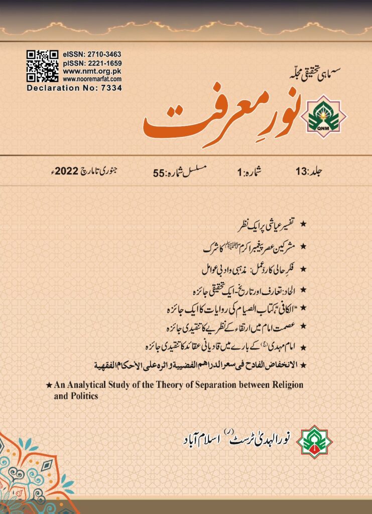 55th serial issue of the qr. Noor-e-Ma’rfat contains 9 articles with 2 editorials (Urdu-English). Actually, the first 2 articles published under the headings of “Atheism: Introduction and History” and “The polytheism of the Polytheists in Holy Prophet’s Age” provide solid intellectual arguments for the eradication of atheistic and polytheistic ideas from human society. A critical examination has been made of Mirza G. A. Qadiani’s claims about Imam Mahdi (as) in the 3rd article and it is proved that his claims are baseless and contrary to the established Islamic beliefs.