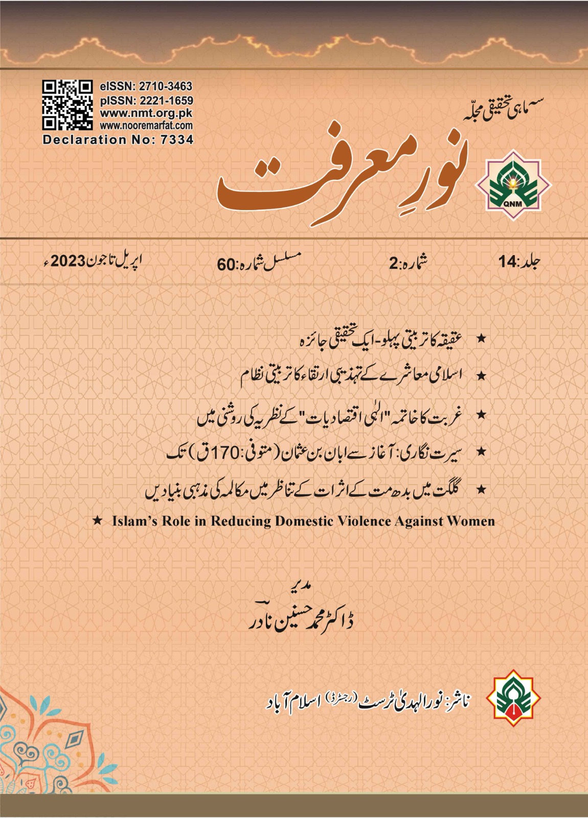 The 60th issue of quarterly research journal Noor-e- Marfat, contains 6 scholarly research articles. The 1st article under the title “Upbringing System of Cultural Evolution of Islamic Society” discovers the core values that cause the uplift of a society. Under the title “Biography: From its Beginning to Aban bin Uthman”, the 2nd article presents a very comprehensive research on a specific type of Muslim historiography, i.e. “Biography”. The 3rd paper demonstrate the Islamic system and some basic rules of child upbringing under the title “Fostering Aspect of Aqiqah – an Exploratory Review”. The 4th paper has initiated interfaith religious dialogue, highlighting the historical and theological status of Buddhism under the title of “Religious Foundations of Dialogue in the Context of Buddhist Influences in Gilgit”.The 5th paper titled “Elimination of Poverty in the Light of the Theory of Divine Economics” claims that the theory of divine economy can wipe out the poverty from human societies. In the last paper, under the title, “Islam’s Role in Reducing Domestic Violence against Women” it is made clear how Islam prevents domestic violence against women. Hopefully, the current issue of “Noor-e-Ma’rfat” will lead our readers towards new dimensions of knowledge and practice.