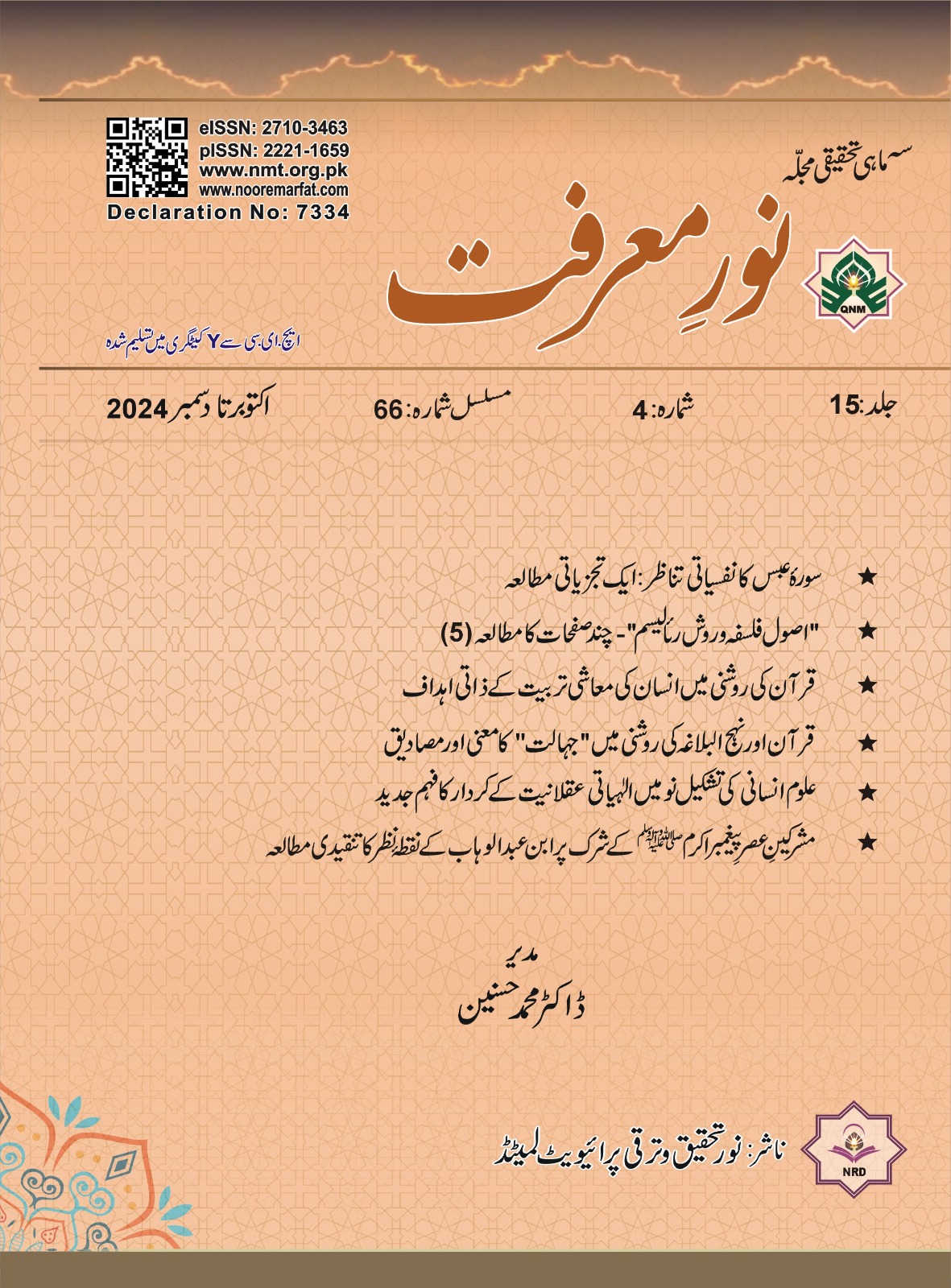 This issue contains 6 scholarly articles. 1st article defines personal goals of economical upbringing of human beings in the light of Holy Quran. 2nd article discusses the meanings and displays of “Ignorance” in the light of Holy Quran and Najh-ul- Balagah. 3rd article demonstrates psychological impacts of words and phrases of Holy Quran in Sura-e Abus. 4th article is a commentary about a few pages from a philosophical work: “Usul-e Falsaf wa Rawish-e Realism” by Allama Tabatabaie. 5th article define the impact of Islamic philosophical rationality in the reconstruction of social sciences and the final article is a critical evaluation of Muhammad Ibn-e Wahhab’s views about Monotheism and Polytheism.