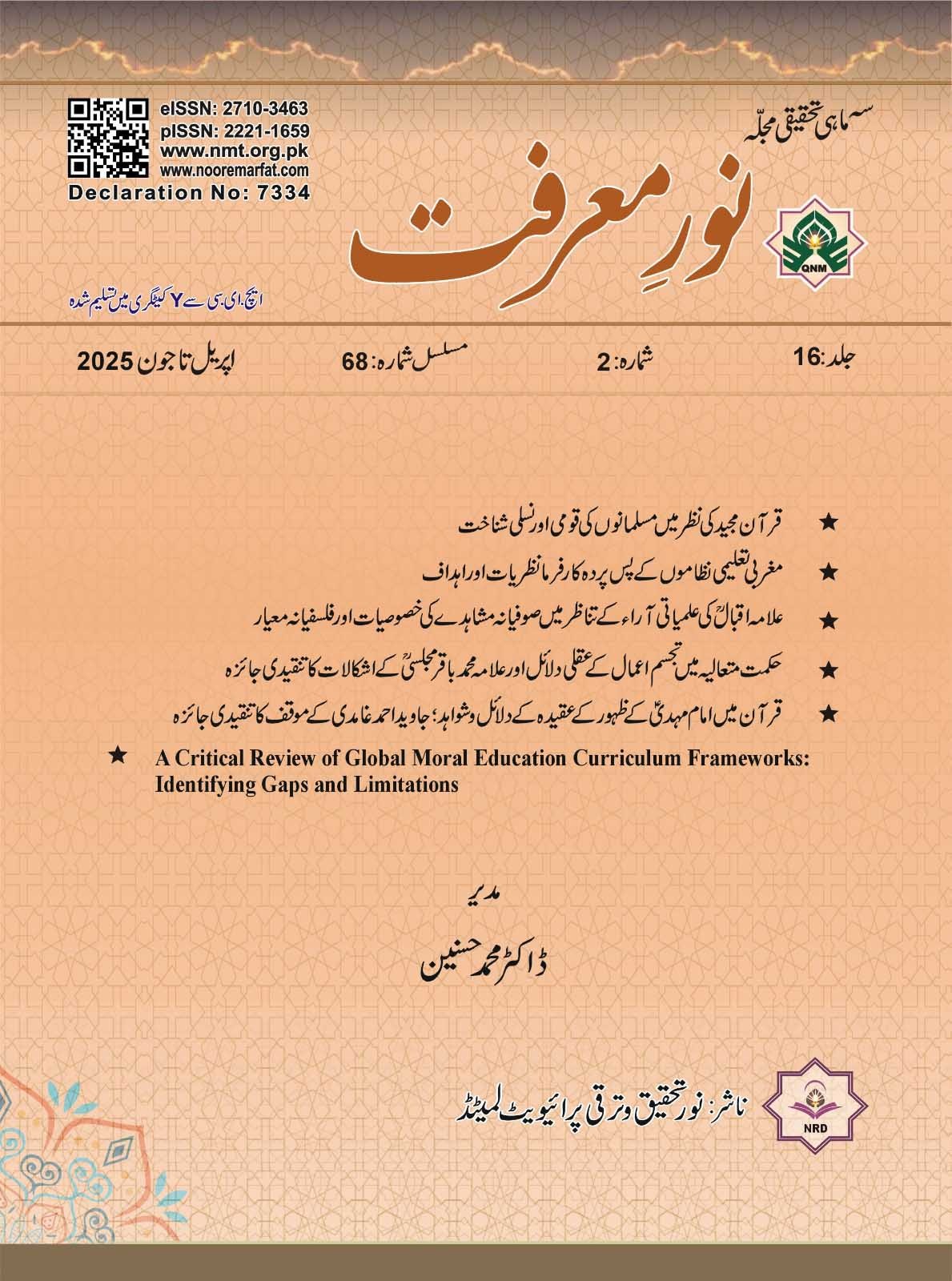 This Issue contains 6 research articles. The first article examines the factors that shape the national identity of Muslims from the perspective of the Quran. The 2nd article examines two general issues. One, on what intellectual, philosophical and religious ideas are the educational systems prevalent in the present world based? Second, if we want to base any system of education and training on the teachings of Islam, what is its starting point? The 3rd article sheds light on the rational arguments for the embodiment of our deeds on the Day of Judgment from the perspective of Mulla Sadra’s philosophy. In the 4th article, mystical experiences and Sufi observations are presented as an important factor in the formation of Islamic civilization in the context of Allama Iqbal‘s sermons. The philosophical validity and scientific value of these experiences and observations are highlighted here. In the 5th article, while rejecting the view of the renowned religious scholar Mr. Ghamidi regarding the belief in the appearance of Imam Mahdi (AS), he presents 5 verses of the Holy Quran in support of the correctness and validity of this belief. The last article draws on research from national education systems in selected countries, including UNESCO, OECD, the United Kingdom, Japan, Malaysia, Pakistan, and Norway, to identify key gaps and challenges, which are attributed to excessive politicization, cultural non-universality, superficial treatment of moral values, and insufficient stakeholder involvement. The paper, while acknowledging the strengths of existing models of moral education, emphasizes the need for a more comprehensive and philosophically grounded approach to moral education.